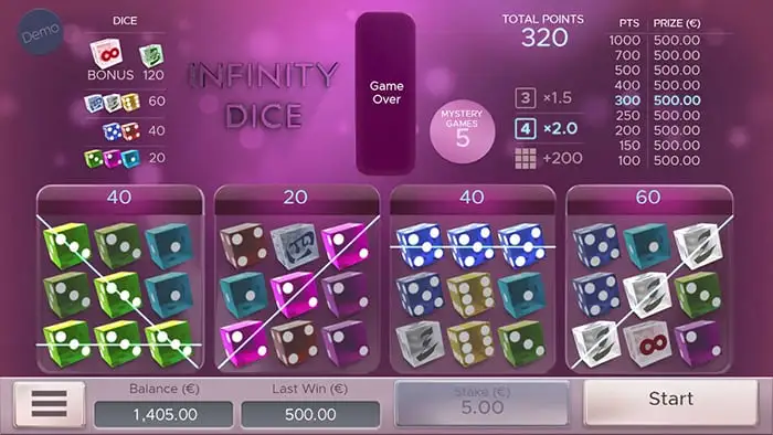 In veel dice games – zoals Infinity Dice – kan je tijdens de bonusrondes een Mystery Game vrijspelen. Zodra je één of meerdere mysteries verzameld hebt, start een nieuw spel. Je doel? Minstens 100 punten scoren.