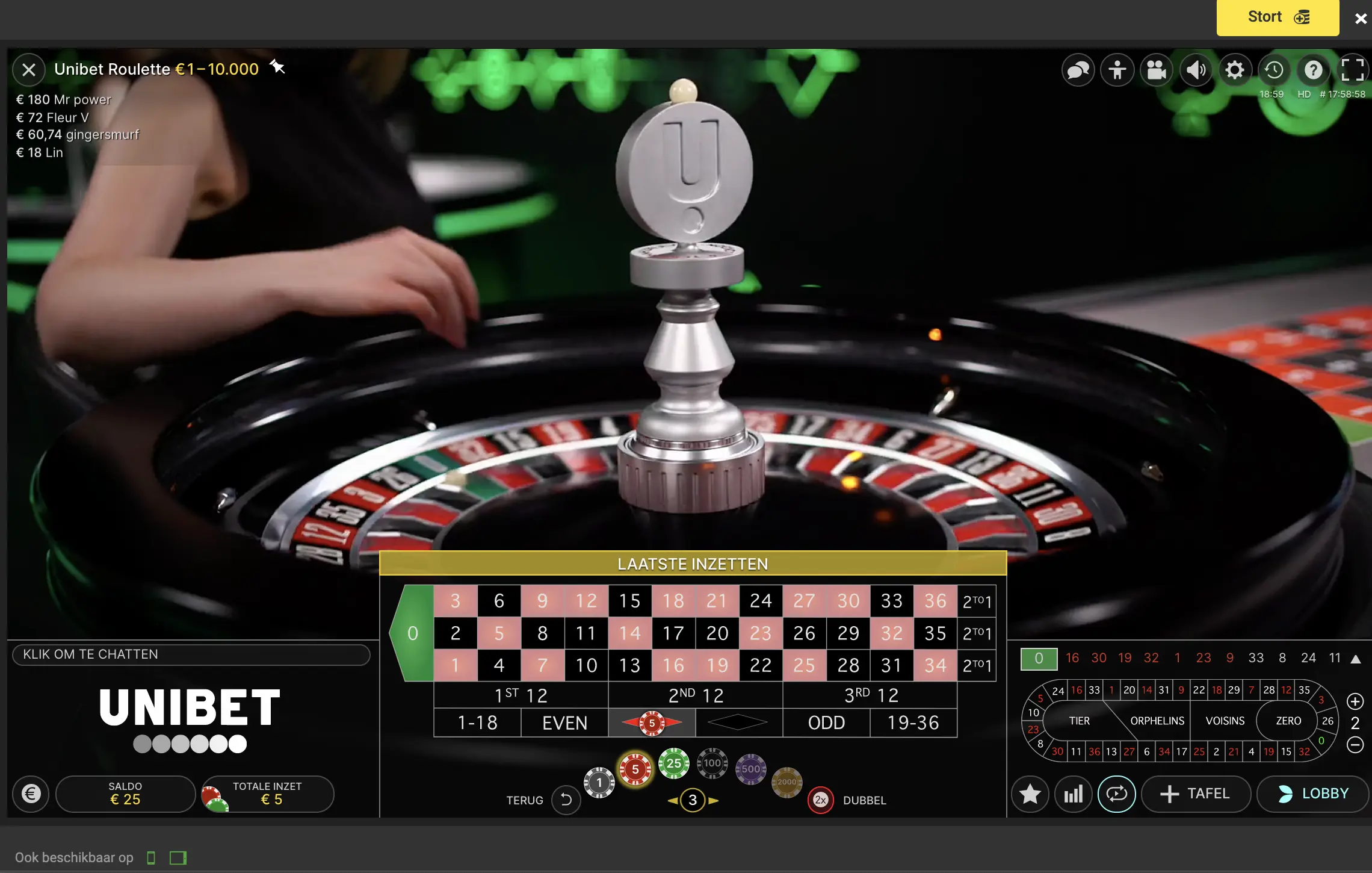 Je plaatst je inzetten digitaal, waarna de croupier het bekende "no more bets" aankondigt. Leuk extraatje: je kan via de livechat zelfs een babbeltje slaan met de croupier – dat maakt het nét wat persoonlijker.