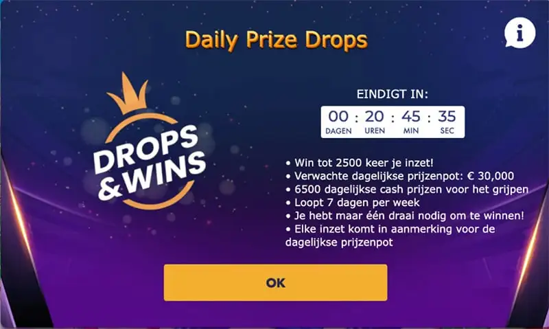 Drop & Win-acties zijn spannende promoties waarbij je tijdens het spelen van populaire Pragmatic Play-games willekeurig geldprijzen kan winnen. De totale prijzenpot kan oplopen tot €1 miljoen, al worden die bedragen wereldwijd verdeeld over alle casino’s die meedoen – het gaat hier om een echte netwerkactie.